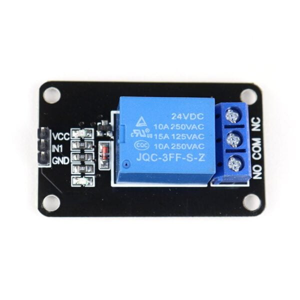 This is a single channel relay board with one 24 volts high current relay. It is an ideal board to control & switch high current loads like a fan, lights, low power heater coils. It not only provides switching but also provides isolation between the power device and your micro-controller. Devices up to 5 Ampere can be switched using this relay.