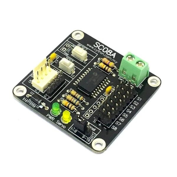 8 Channel Servo Controller SC08A offers reliable yet user-friendly RC Servo motor controller to hobbyist and students. This SC08A can control 8 channels of servo simultaneously. The advantages of this SC08A over SC16A are the user is able to deactivate any servo channel at any time and the user can even set the initial position of any channel at the next startup.