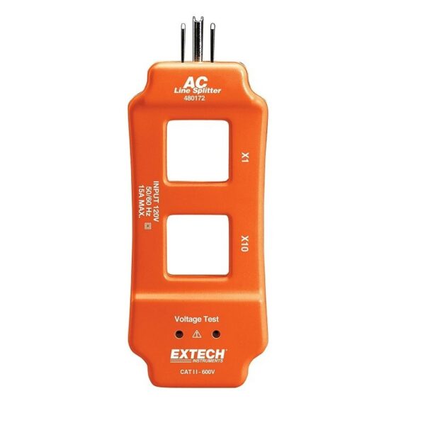 This Extech 480172 Line Splitter provides a fast and easy way to “open” standard 120 Volt AC electrical lines, eliminating the need to cut off the plug and separate the conductors. When connected between a 120 Volt AC outlet and a device under test, this splitter separates the hot/live conductor from the neutral and ground, which enables users to measure AC current up to 15 Amp on a two-wire or three-wire lines using a clamp meter. This splitter also features two Voltage Test jacks so that voltage can be measured using a multimeter.