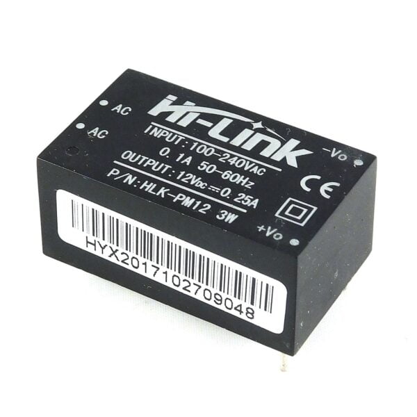 HLK-PM12 12V/3W Switch Power Supply Module is plastic enclosed PCB mounted isolated switching step-down power supply module. It can supply 12V DC from 120V AC – 230V AC and has a power rating of 3 Watt. This makes it perfect for small projects that needs a 12 volt supply from mains. There are many advantages for these modules, such as low-temperature rise, low power, high efficiency, high reliability, high-security isolation etc.