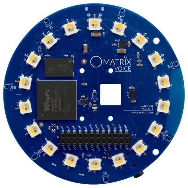 MATRIX Voice is a development board for building sound driven behaviors and interfaces. MATRIX Voice is an open-source voice recognition consisting of a 3.14″ diameter development board with an onboard ESP32 WiFi microcontroller, a radial array of 7 MEMS microphones, a Xilinx Spartan6 FPGA with 64 Mbit SDRAM, 18 RGBW LEDs, and 64 GPIO pins. The Matrix Voice provides developers the opportunity to integrate custom voice & hardware-accelerated machine learning technology right onto the silicon. The energy-efficient ESP32 allows for operation without an attached SBC and can be programmed with the Arduino IDE.