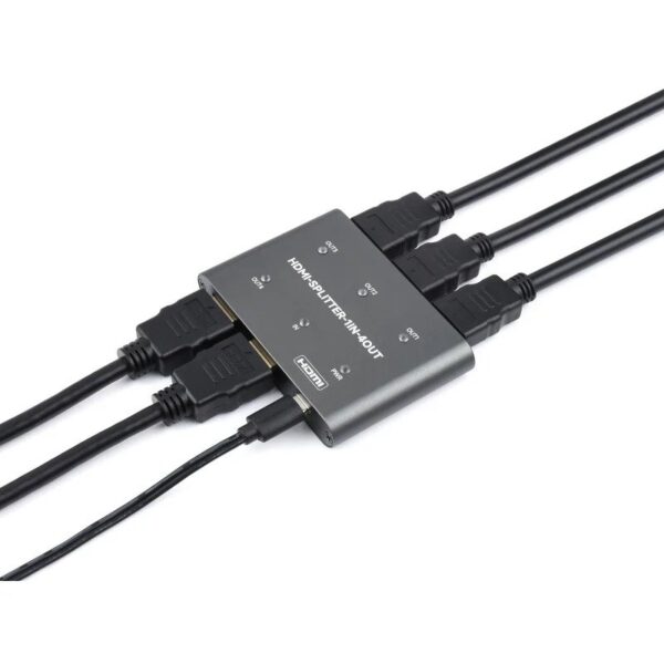 HDMI-SPLITTER-1IN-4OUT, an HDMI splitter, allows multi-display devices to share one HDMI source. Support the HDMI input signal with 4K x 2K@30Hz and 4K/2K (YCbCr420)@60Hz resolution, and the equalizer at the HDMI input end and the adjustable drive capability at the output end can adapt to wires of different lengths and qualities, making the high-speed TMDS signal always have the best performance
