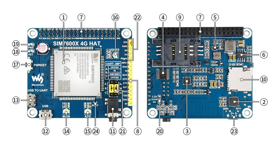 - UART selection jumper A: access Raspberry Pi via USB to UART B: control the SIM7600 by Raspberry Pi C: control the SIM7600 via USB to UART