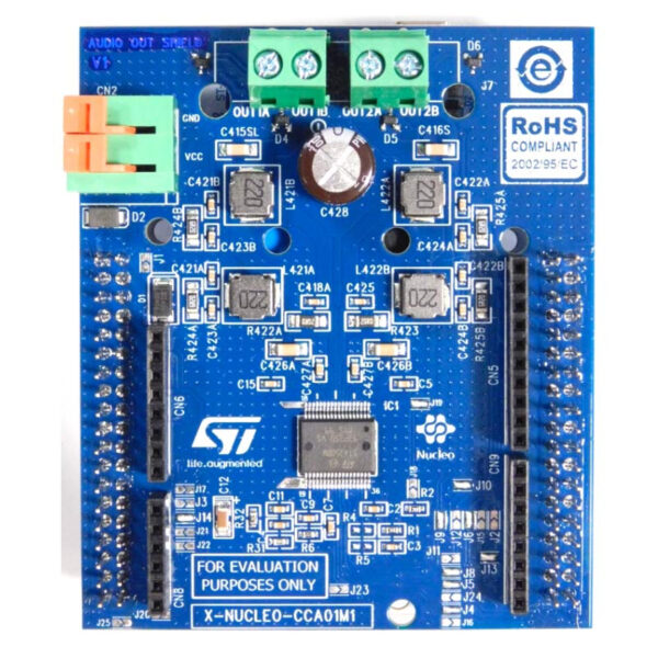 The X-NUCLEO-CCA01M1 is an expansion board based on the STA350BW Sound Terminal 2.1-channel high-efficiency digital audio output system. It can be plugged on top of an STM32 Nucleo board and is compatible with the ST morpho connector layout. It enables the output of digital audio streams to a speakers pairs connected directly to the board and allows the evaluation of the STMicroelectronics STA350BW digital audio output component. Up to two X-NUCLEOCCA01M1 expansion boards can be plugged on top of the same STM32 Nucleo host in order to build a four-channel digital audio output system. The communication between the STM32 MCU and the STA350BW device is performed through the I²C bus interface for setup and control purposes and the I²S bus for digital audio transmission. A dedicated connector is available on the board in order to supply the power source for the output stage.